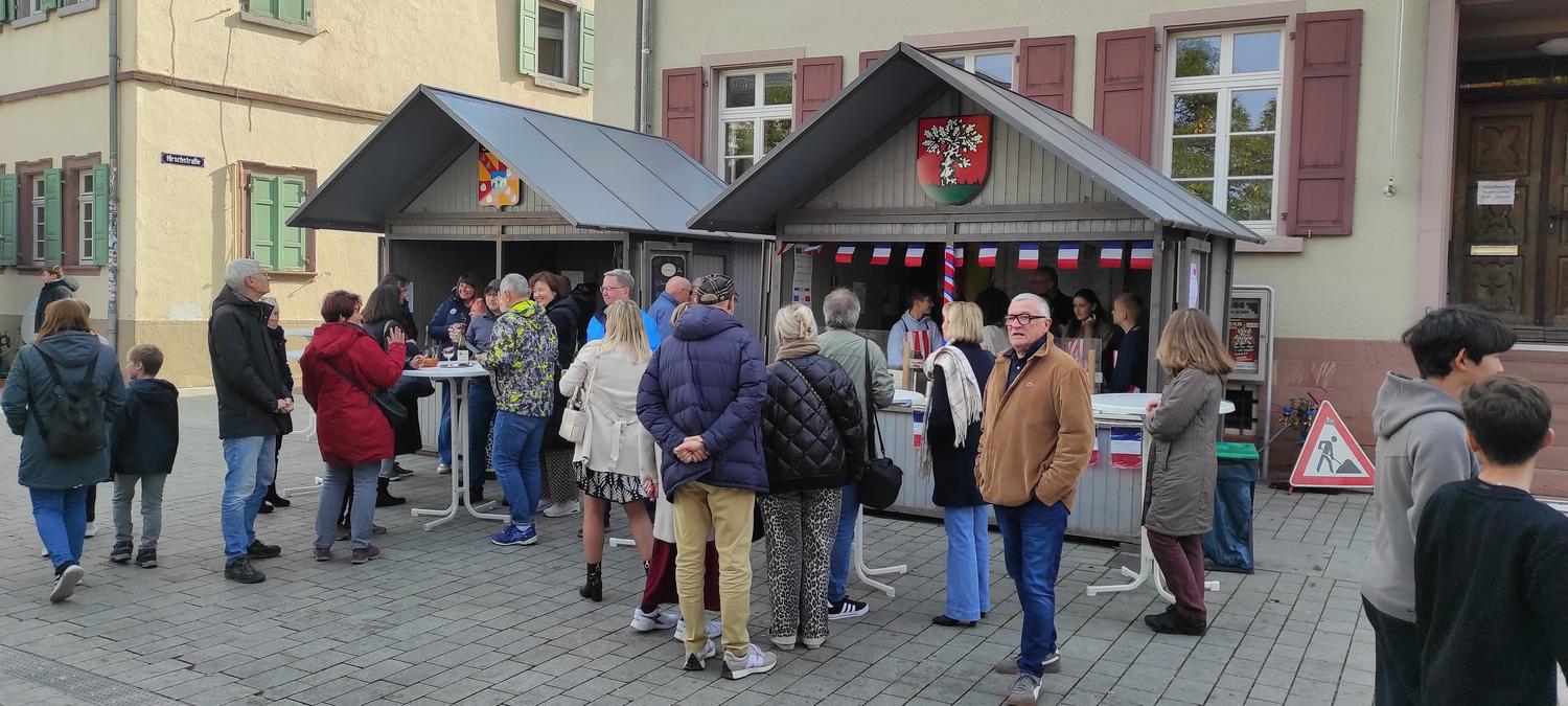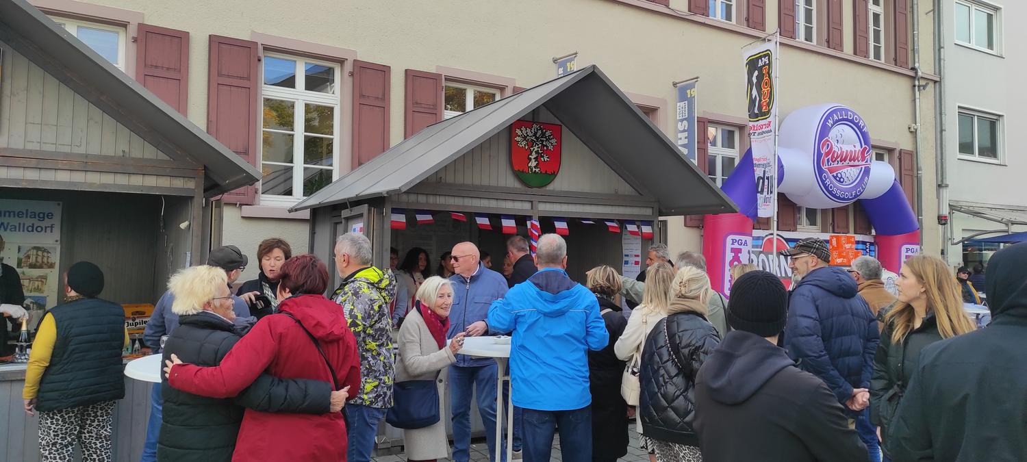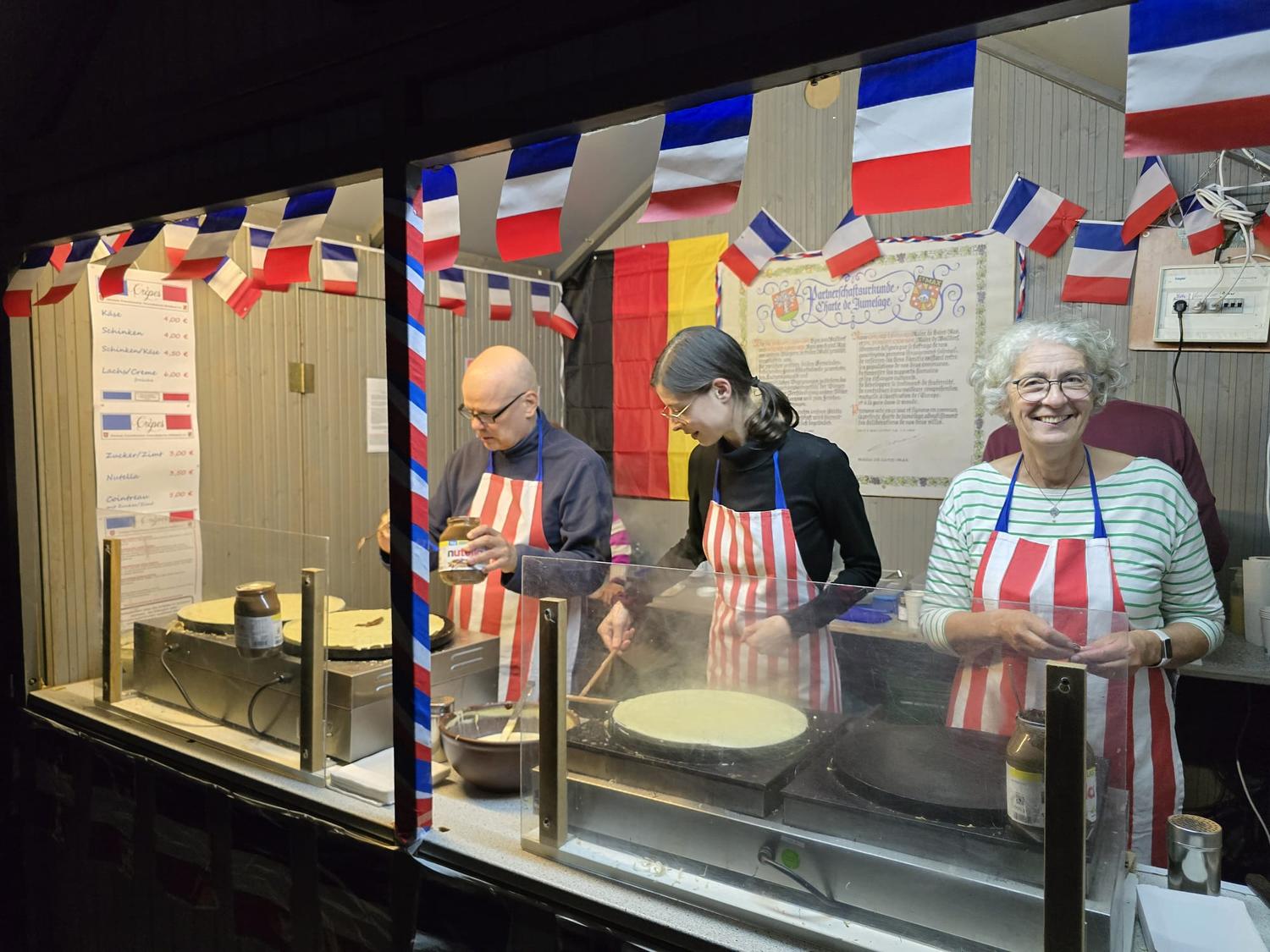 Wie jedes Jahr gab es auch 2025 wieder unsere Crêpes am Stand auf der Walldorfer Kerwe vor dem Alten Rathaus zu genießen. Im Stand rechts von uns konnten Sie sich bei unseren Freunden aus Saint-Max wieder ein gutes Glas Rosé, Rotwein oder Champagner aus Frankreich genehmigen. Viele Besucher der Walldorfer Kerwe nahmen unser Angebot von Crêpes sowie der Getränke unserer Franzosen gerne an. Dies ist umso erfreulicher, da wir uns auch dieses Jahr mit unserem Angebot gegenüber anderen Ständen auf der Kerwe behaupten mussten, die Crêpes anboten.