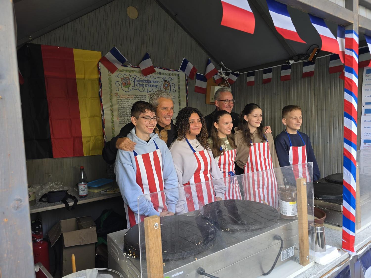 Beim Besuch der französischen Delegation aus unserer Partnerstadt Saint-Max aus Mitgliedern der Stadtverwaltung und des französischen Freundschaftsvereins ließen es sich Bürgermeister Pensalfini von Saint-Max und unser Bürgermeister nicht nehmen, ein Foto mit ein paar engagierten Jugendlichen am Crêpes-Stand aufzunehmen.