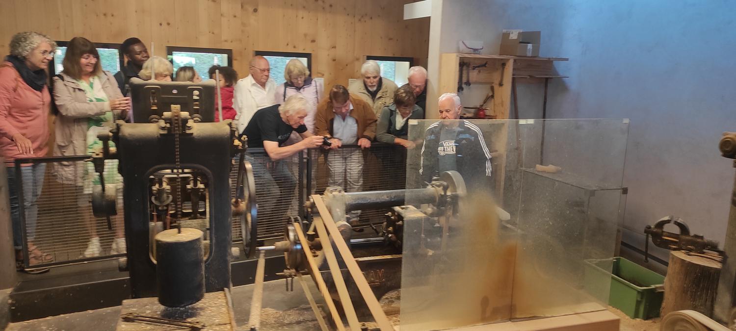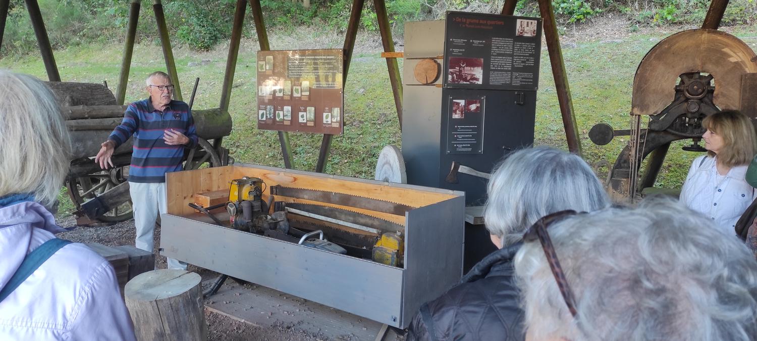 Unser erster Sachverständiger, Herr Krebs, gab uns zunächst einen kurzen Abriss der Geschichte des Holzschuhmacherhandwerks. Dieses entstand, um Bauern für ihre Arbeit eine Schutzbeschuhung bereitzustellen; aber auch Glasbläser, die früher in Soucht und später in Meisenthal und der weiteren Umgebung tätig waren, benötigten „Sabots“ für ihr Handwerk. Damals lebten die Holzschuhmacher noch im Wald in unmittelbarer Nähe zu ihrer Rohstoffquelle, bis es möglich war, die Baumstämme der geschlagenen Buchen in das Dorf zu transportieren, gegen Ende des 19. Jahrhunderts. Herr Krebs führte uns vor, wie Baumstämme von den Holzkarren auf- und abgeladen werden konnten. Die Stufen der Fertigung vom Baumstamm zum Holzschuhrohling inkl. der verschiedenen mechanischen Geräte, die dafür benötigt werden, wurden uns ebenfalls anschaulich vorgeführt.